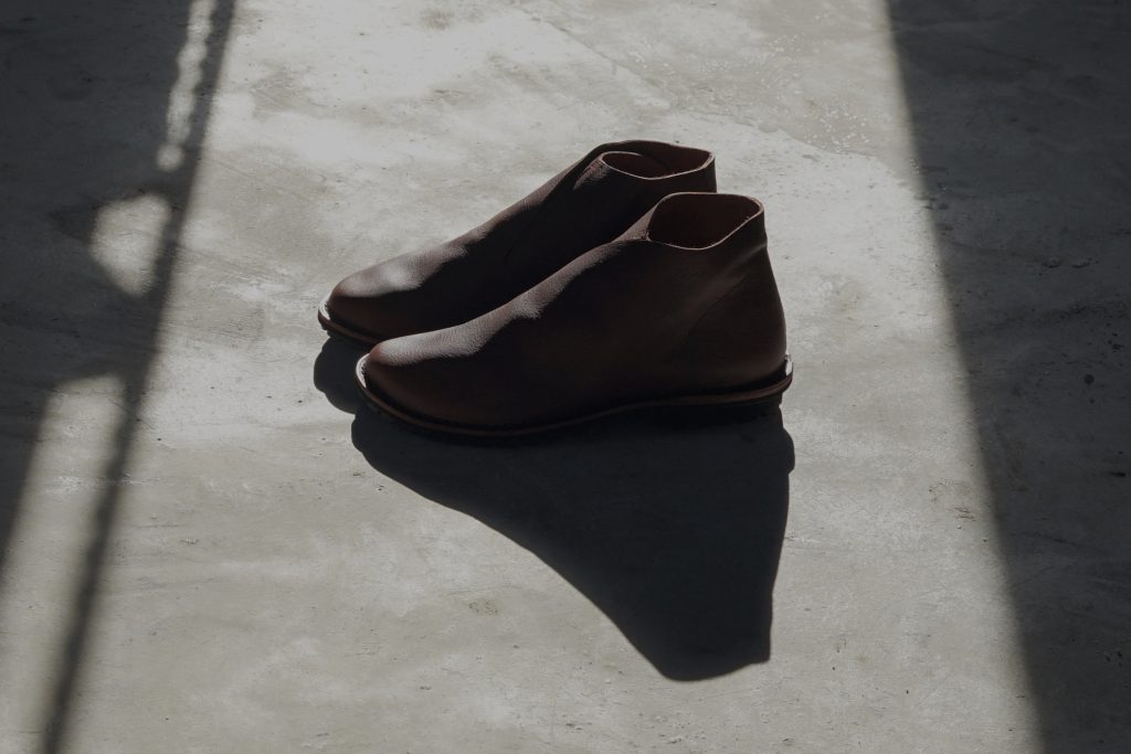 軽やかな羽織のような“y-shoes”の発表から6年、「構造として必要なものをすべて内側に収め、 表からはできるだけ見せない」という同シリーズの本質をそのままにブーツを作れないか、と試行錯誤が続いていました。しかし、脱ぎ履きのしやすさとサポート性を両立させ、くるぶしの高さまで革で覆う、という複数の条件をクリアするには幾重もの障壁がありました。